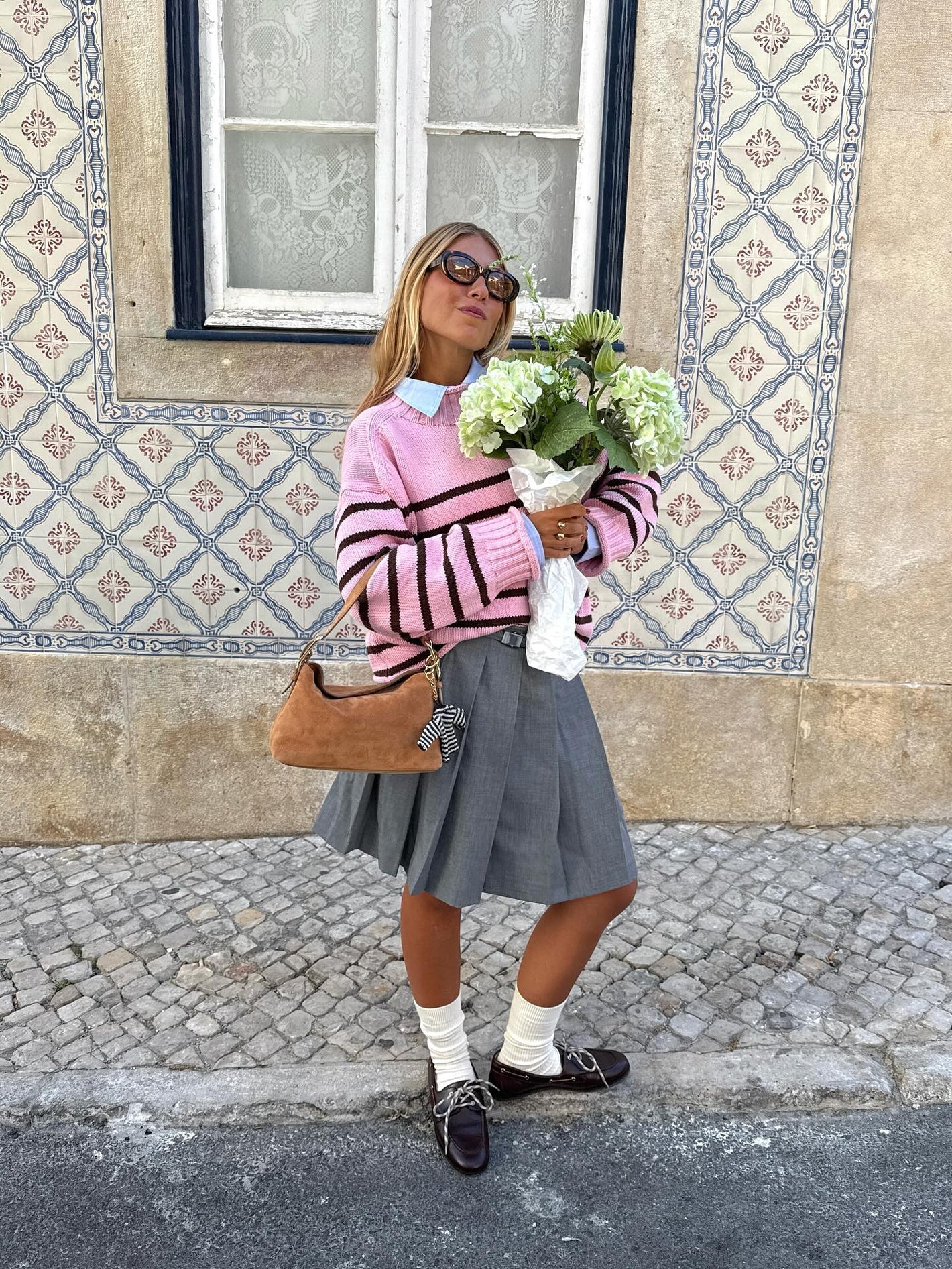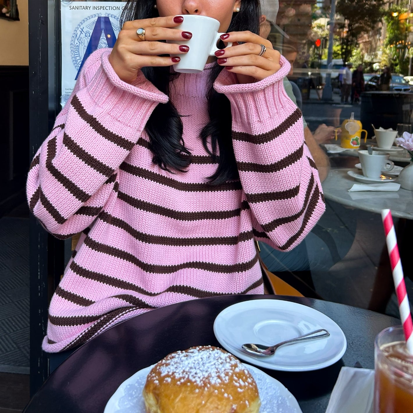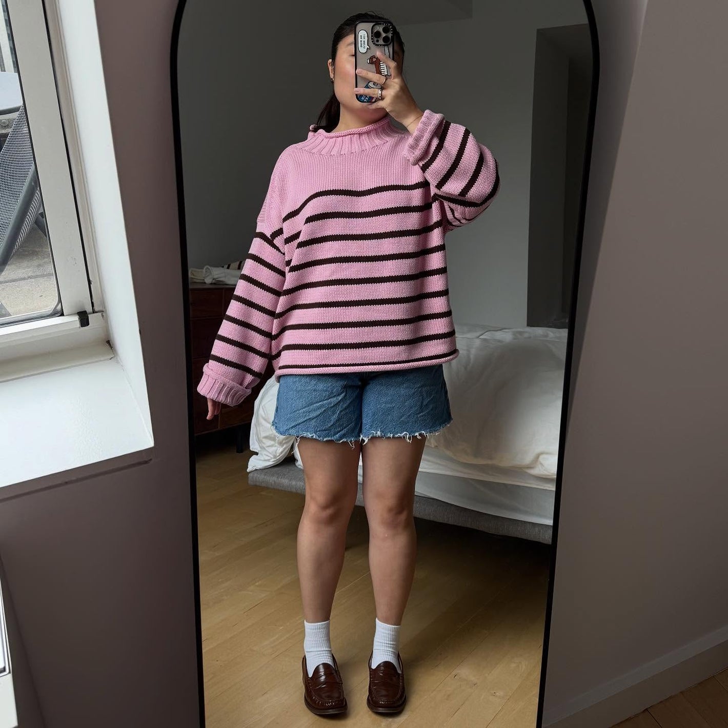 ★★★★★Wore this with my pleated skirt and loafers and felt like I stepped out of a fashion editorial. The white collar peeking out underneath? Chef's kiss. The oversized fit is perfect and the pink + brown stripes are so fall. Everyone kept asking where I got it.